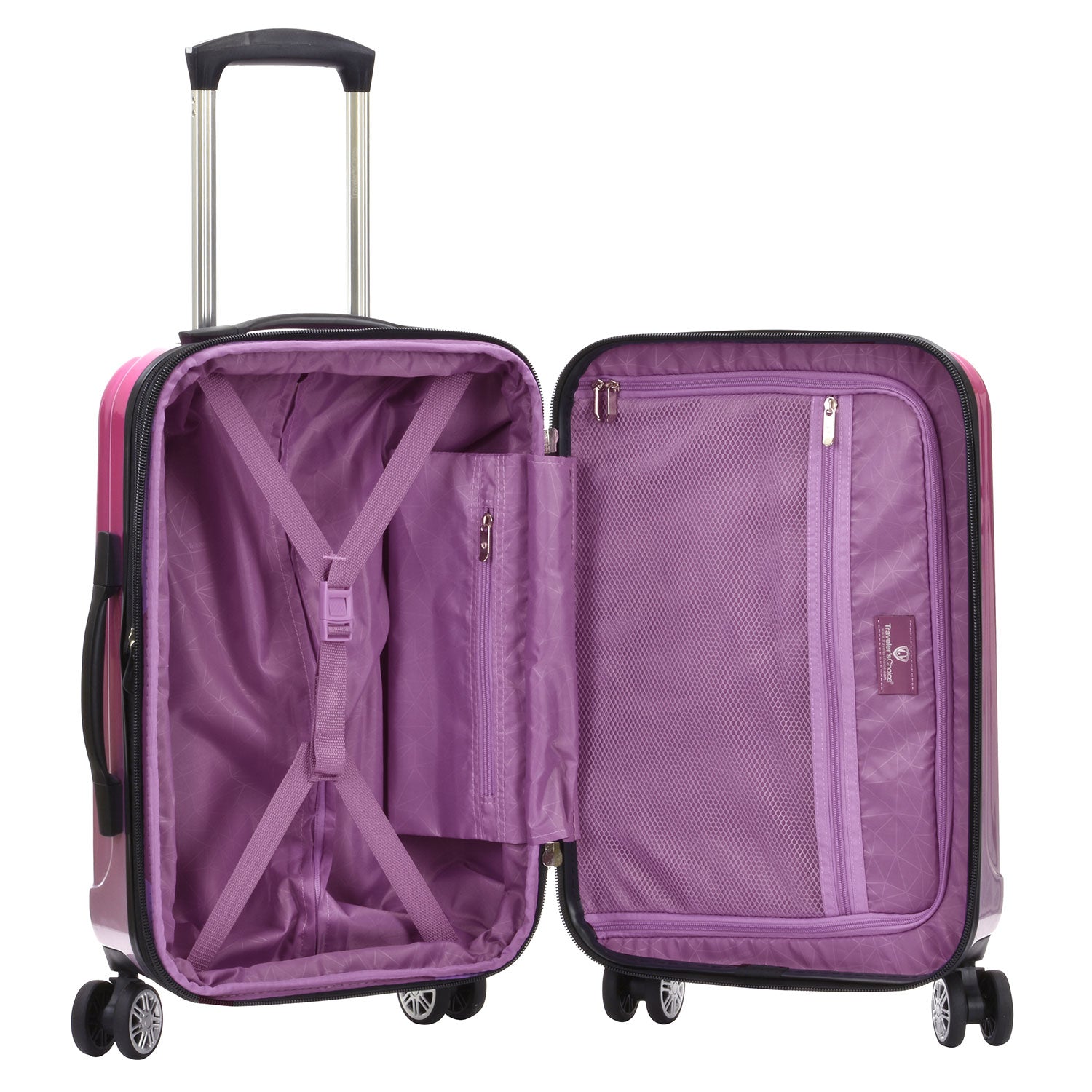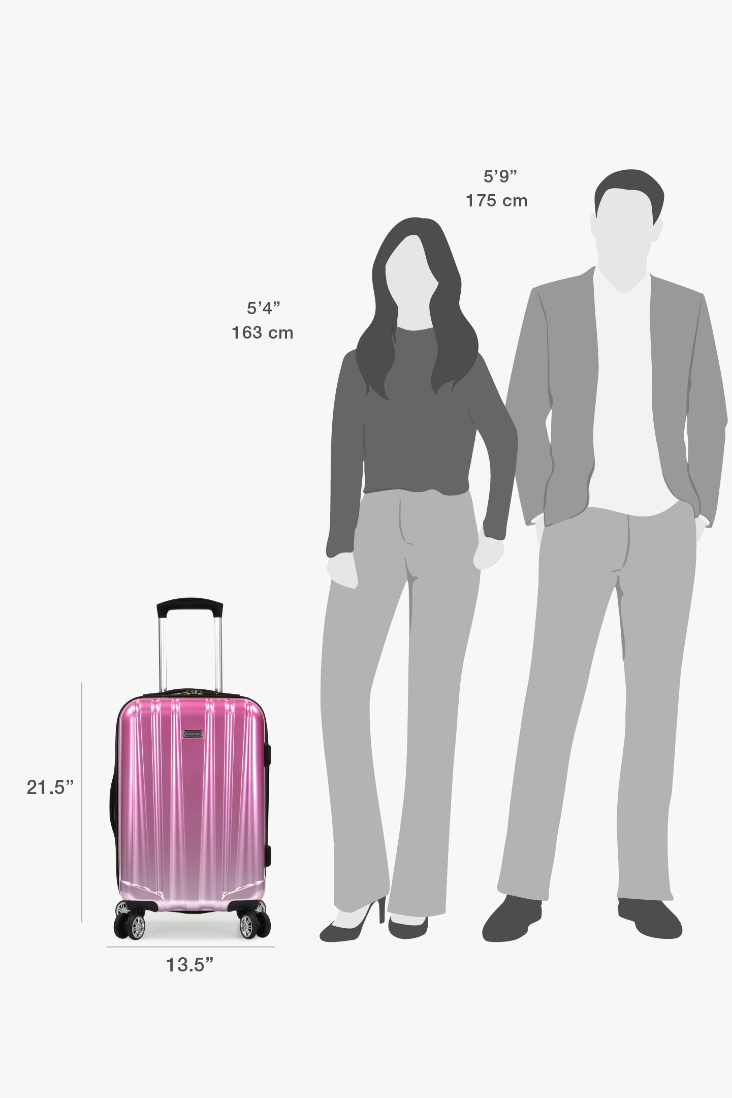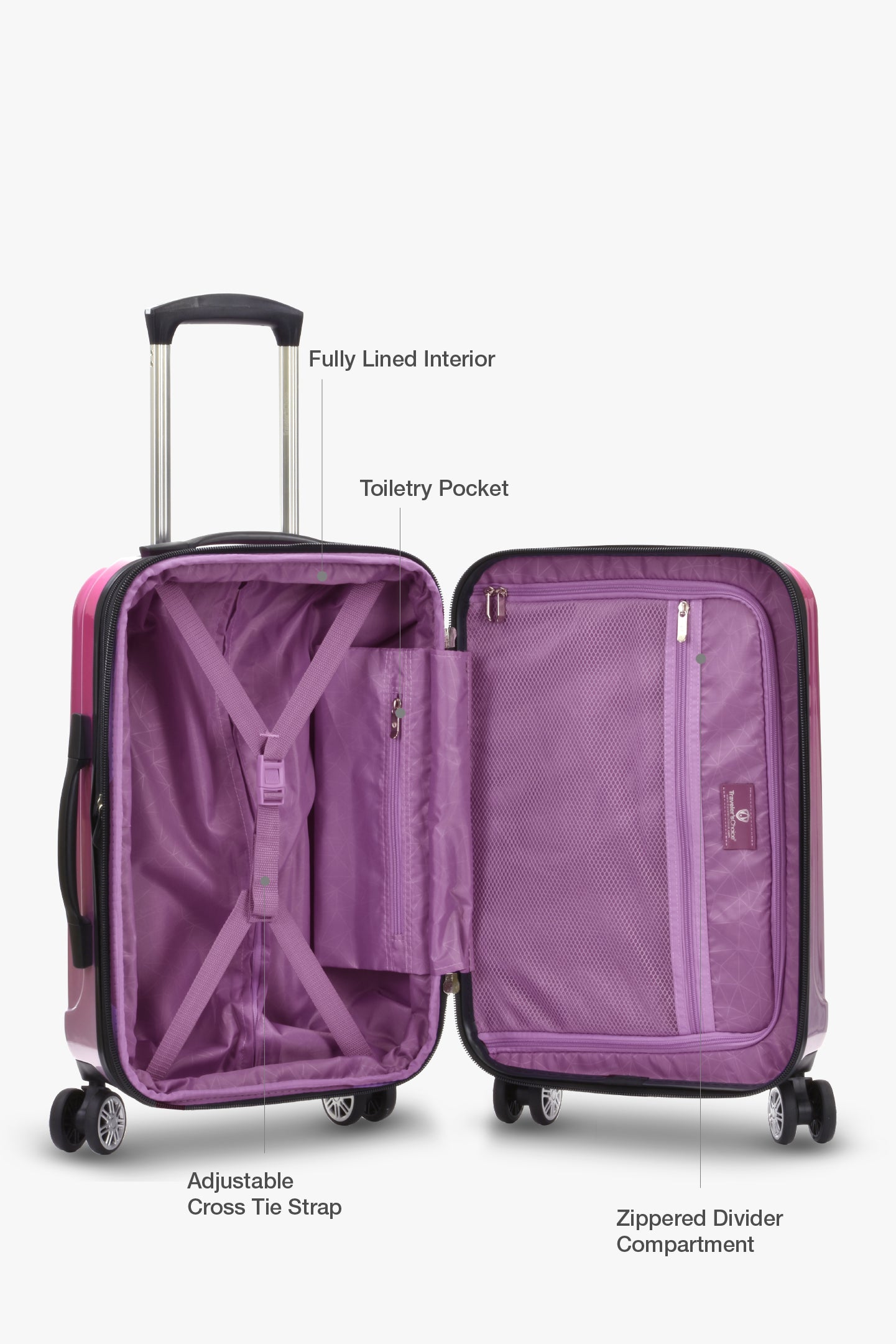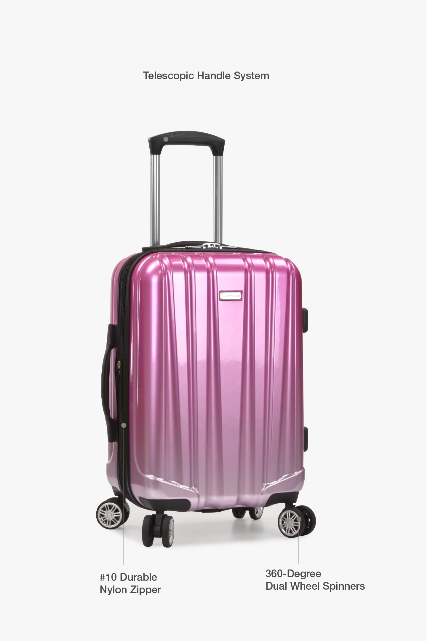The Ruma II enhances your travel experience with its sleek and stylish design, featuring a gorgeous ombre laser finish for a premium touch. The 360-degree silent-running dual spinner wheels offer effortless maneuverability, while the retractable push-button lock aluminum telescopic handle ensures easy handling. The fully-lined interior includes a zippered divider cover and detachable cross tie straps for optimal organization. An expansion gusset in the main compartment provides additional packing space. Matching hardware on the zipper pulls, wheel covers, and recessed handle adds a touch of elegance and functionality.
